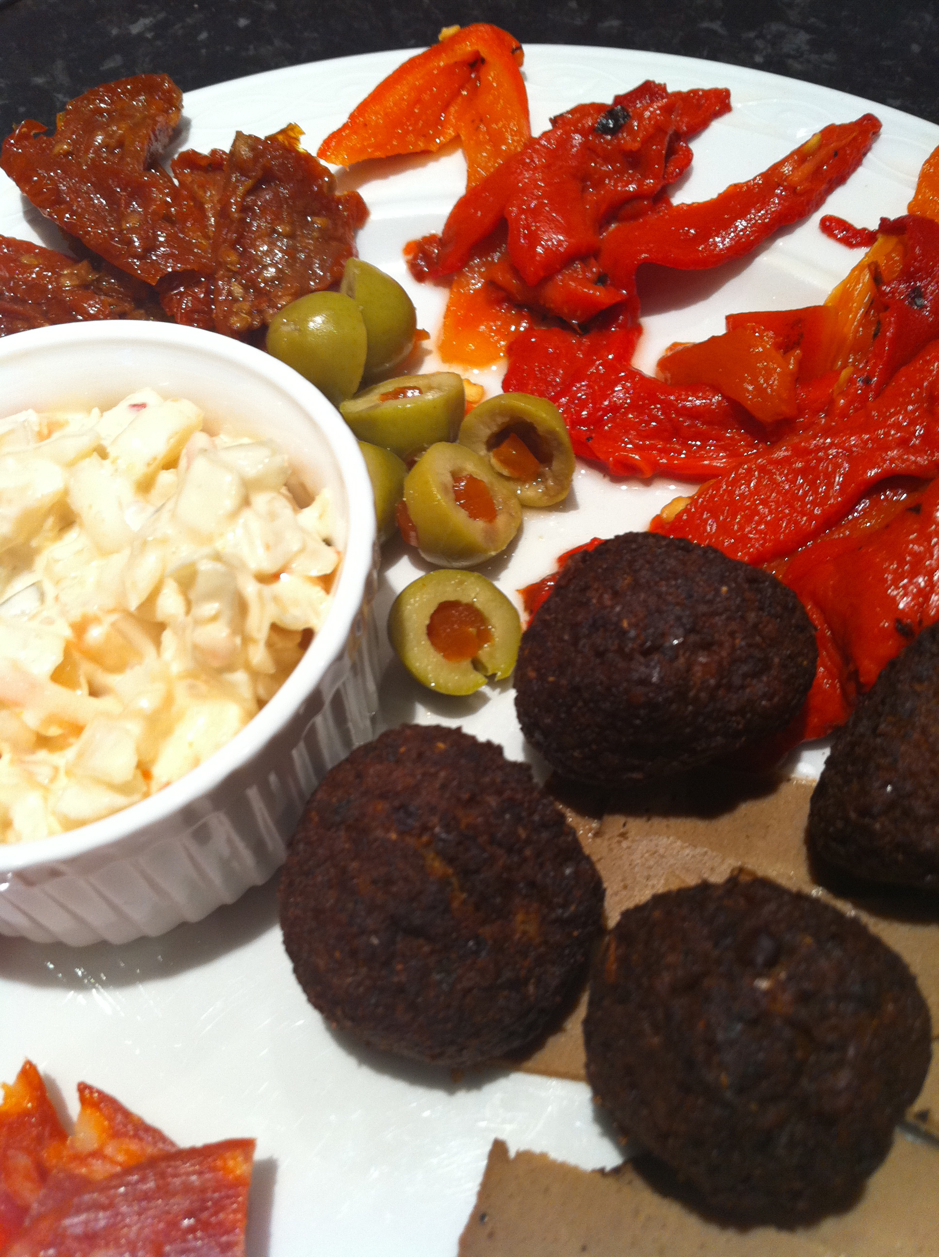 To accompany the camembert we usually choose a selection of goodies to dip in and top the lovely fresh bread we buy. On this occasion we have (clockwise, from top) roasted red peppers, falafal, Quorn roast beef slices (remember our Royal Wedding party platter?) sliced chorizo, coleslaw and sundried tomatoes. Seems like a bit of a medley but trust me, it works!