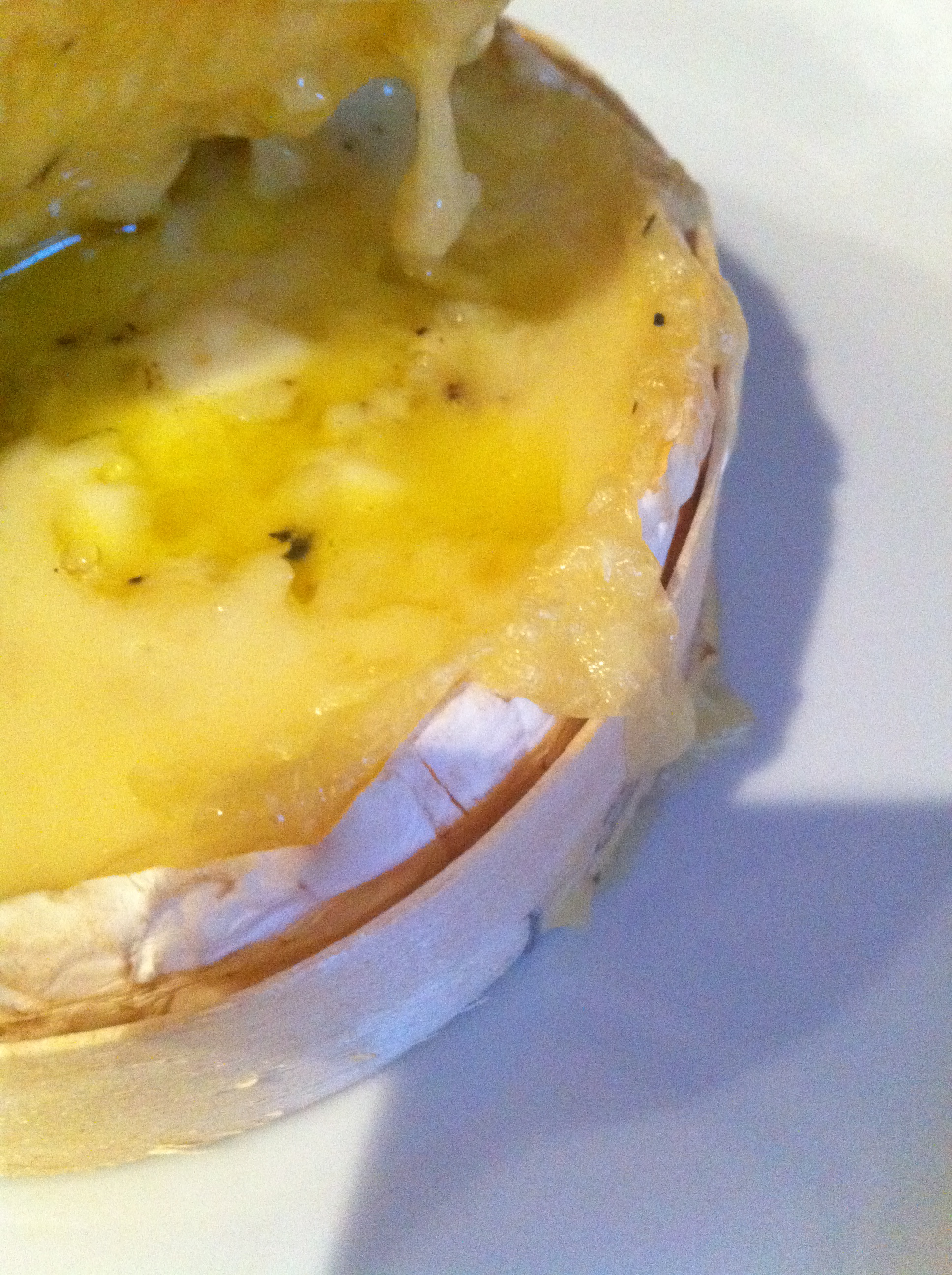 I tried to get an ‘innards’ shot! To make the camembert all nice and flavourful, I first carefully slice the top rind off and set it aside (don’t throw it away because it’s going back on!). I cut a garlic clove into thin slices and stuck them into the soft inner cheese, along with salt, pepper, a drizzle of olive oil and the top slice of rind. The cheese bakes in it’s box for about half an hour in a hot oven. When I took it out it smelt AMAZING and all the inside had fully melted, engulfing the now soft garlic slices and transforming the hard cheese into a gooey dip.