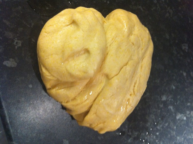I left it to rise for an hour while I got on with prepping the other two courses. When I took it out it looked like this – unintentionally heart-shaped, how quaint!