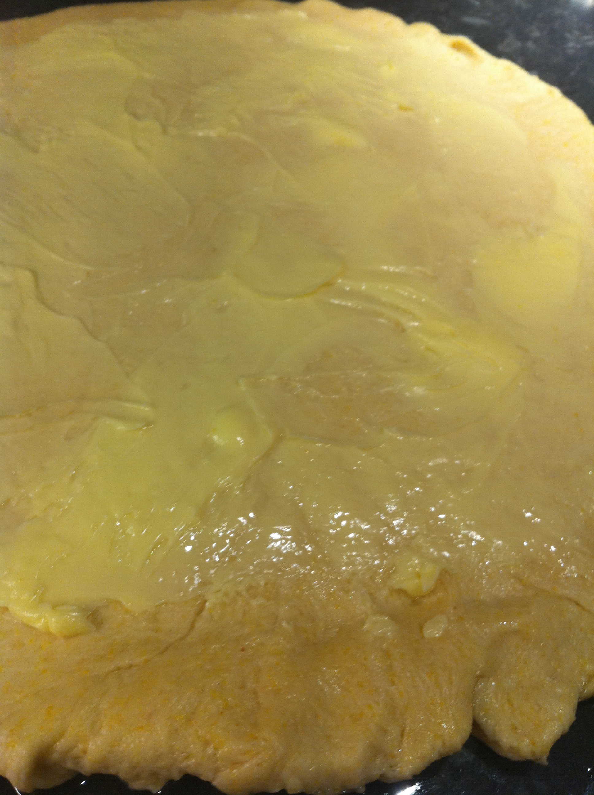 Next up was the laminating – spreading a thin layer of butter on the dough and then rolling it up to make the dough flaky, buttery and crusty. Mmmmm. Worked perfectly!