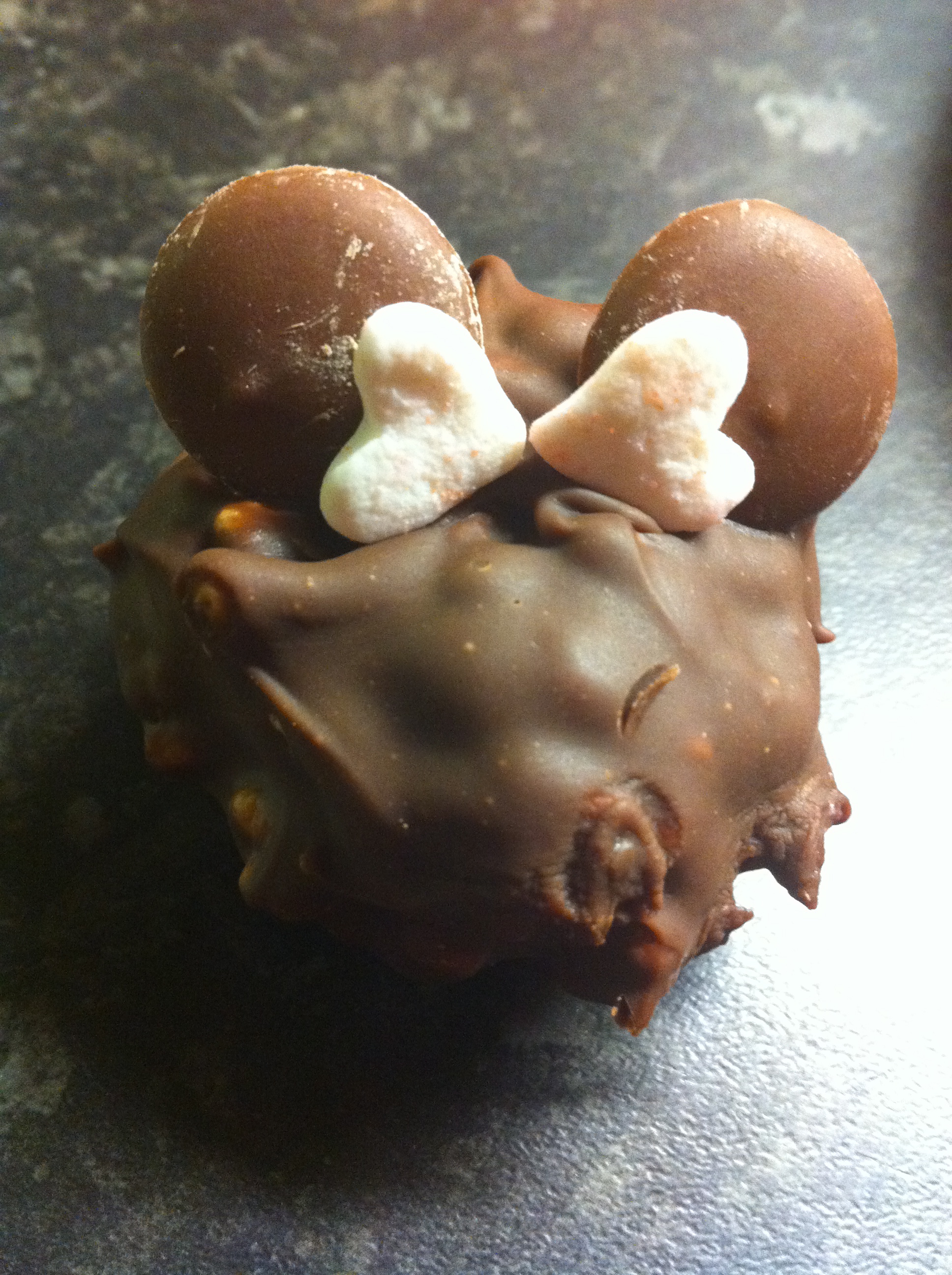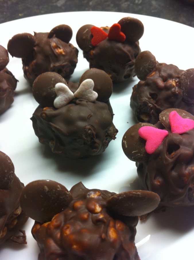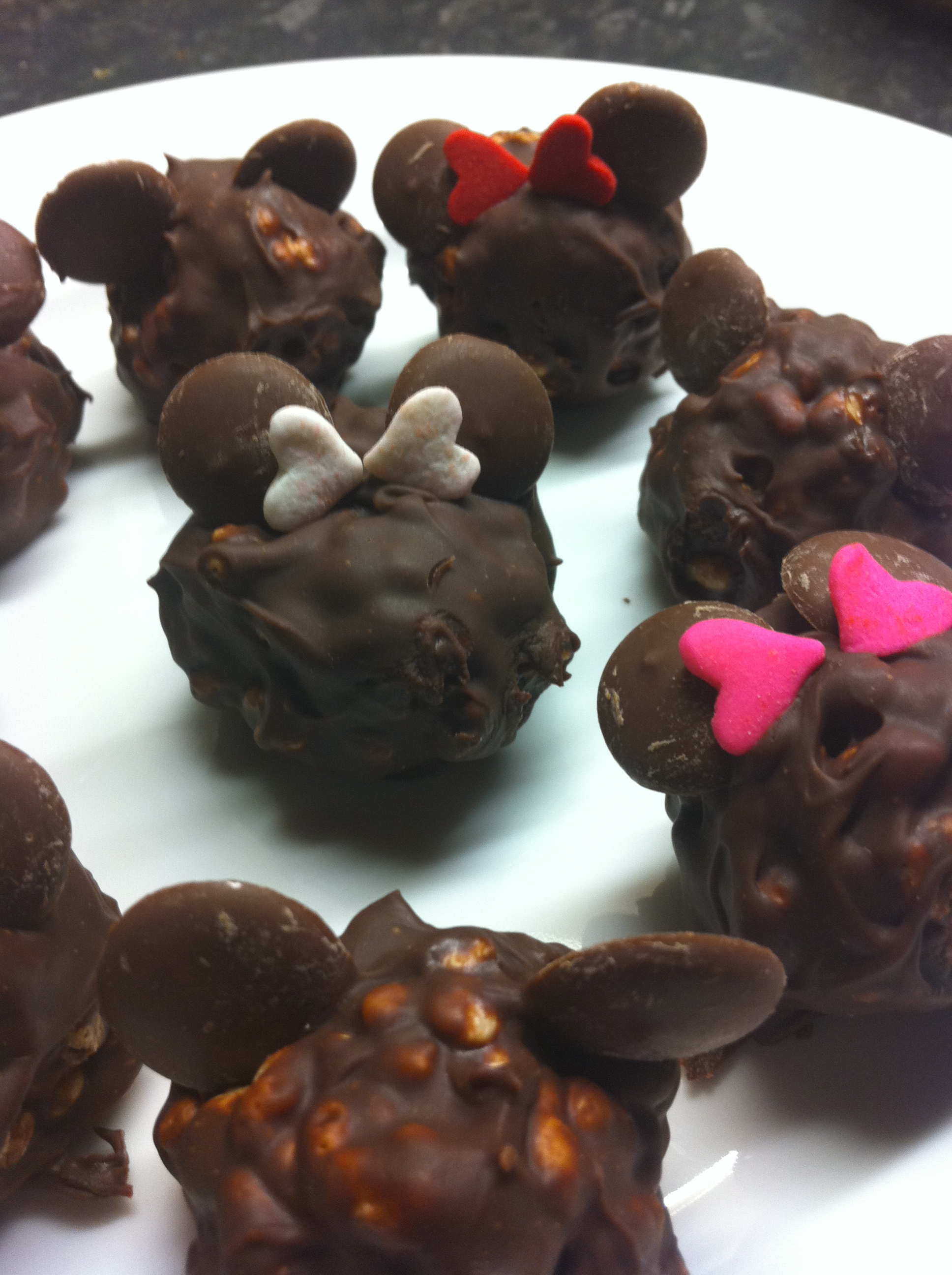 Mickey and Minnie cake pop rice krispy treat…things. In my head they were a lot more polished and less…homemade looking…but that, I think, is the beauty of them! They were super easy to make – I melted a jar of Marshmallow Fluff, mixed it with rice krispies and moulded them into tiny little balls – a very difficult task; the fluff mixture was so sticky that they just stuck to my hands and not to each other! Eventually I got them to stick, dipped them in a mixture of chocolate and cream and stuck chocolate buttons on as ears. In a stroke of genius, I added heart-shaped cupcake decorations for Minnie’s bow 🙂