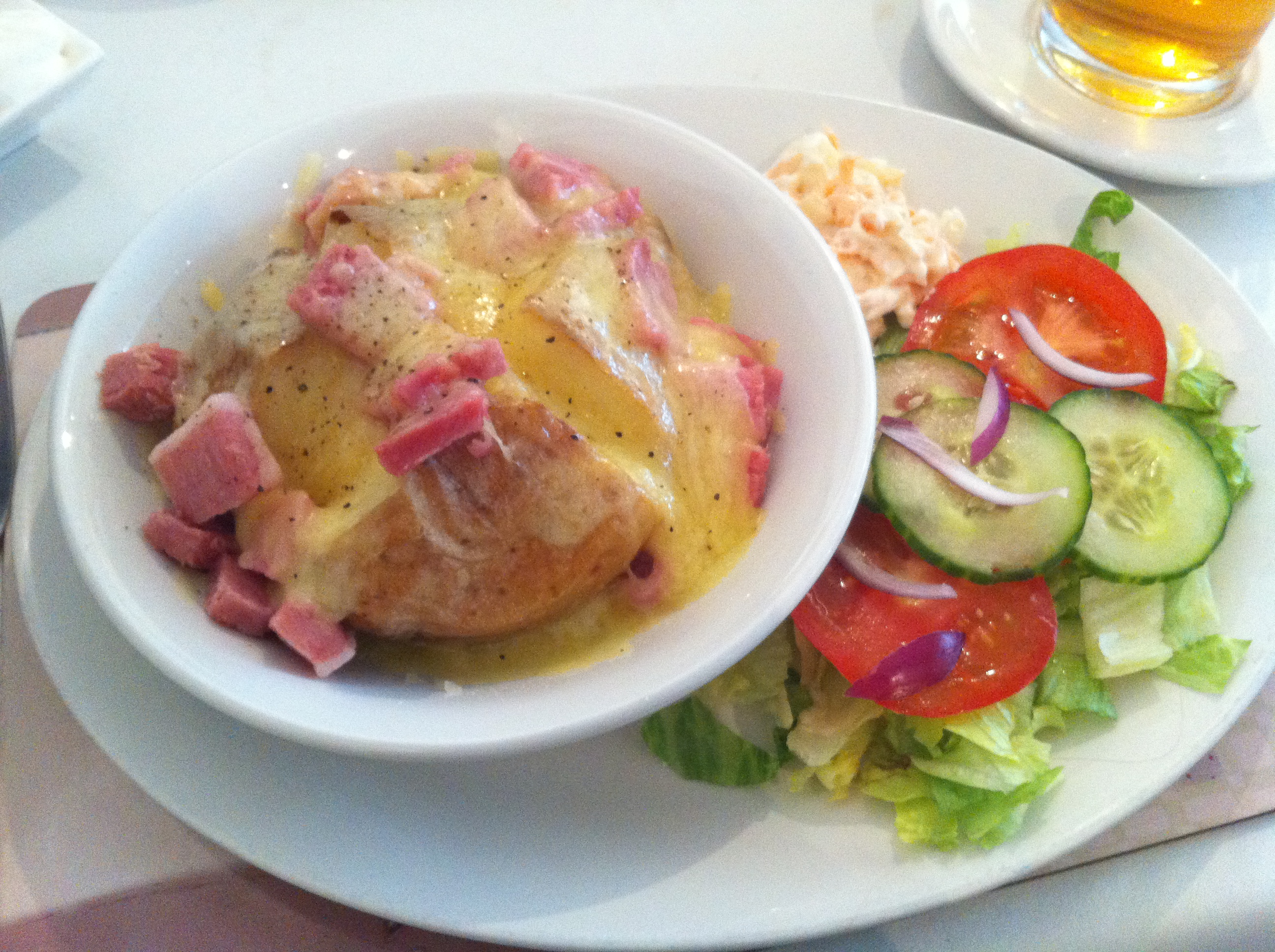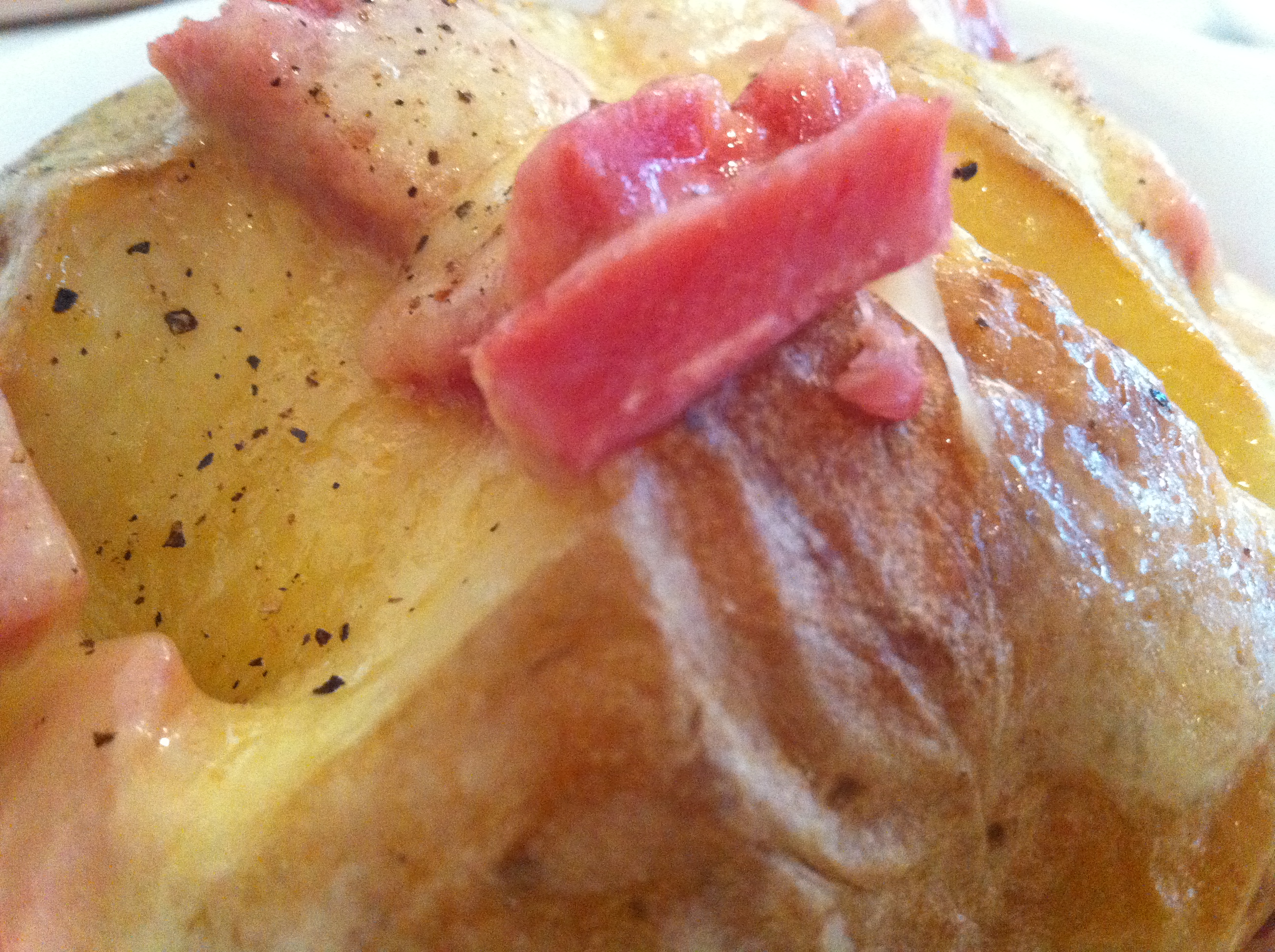 Polly’s serves a full breakfast menu til 12 noon (Full English’s, sausage and bacon baps, scrambled eggs etc) and then an extensive lunch menu which includes jacket potatoes, sandwiches, baguettes, panini’s, omelettes and hot meals like ham, egg and chips. I was torn between a hot, buttery baked potato and a simple chicken mayo baguette. In the end the jacket potato won out and we actually both ordered them; mine with ham and cheese and Ben’s with the classic combo of cheese and beans. My Mum scolded me as a ham and cheese jacket potato is not TECHNICALLY on the menu but if you remember from the Morgan Christmas 2011 post, my Dad does a mean baked ham and quite frankly it would have been rude not to sample some.