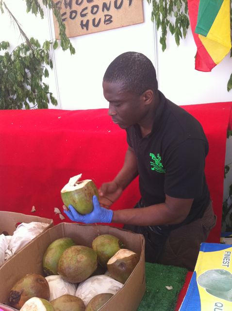 We immediately saw a stand we wouldn’t be able to bypass. It was probably the loudest stall in the festival, with two Jamaican guys loudly singing and shouting about the product. Which was…rum filled coconuts!! I’m not even joking.