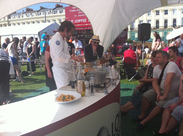 We then decided to make the effort and check out the star of the day, Mr Lloyd Grossman himself, who was doing cooking demonstrations throughout the day in a marquee in the middle of the festival. We tried to book seats for the event when the booth opened at 1pm but the queue was snaking round back through the entrance so we left it. When we walked past just before the demonstration was due to start, there were free seats! Score! I was so excited to see the legend that is Lloyd Grossman that I took a ton of photos just of him, before the cooking had even started. I will share just one, for your viewing pleasure. He was wearing a stunning hat!
