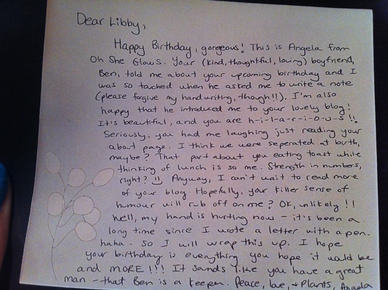He had!! The sweetest, most thoughtful note ever from the amazing Angela at Oh She Glows π Highlights include Angela saying she’s read my blog and thinks I’m hilarious (!!!) saying that she’s found a kindred spirit in me as she also thinks about lunch whilst eating breakfast AND the fact that she signed off with peace, love and plants. I actually love her. I was full on sniffling like a little girl at this point and Ben was pretty close himself!