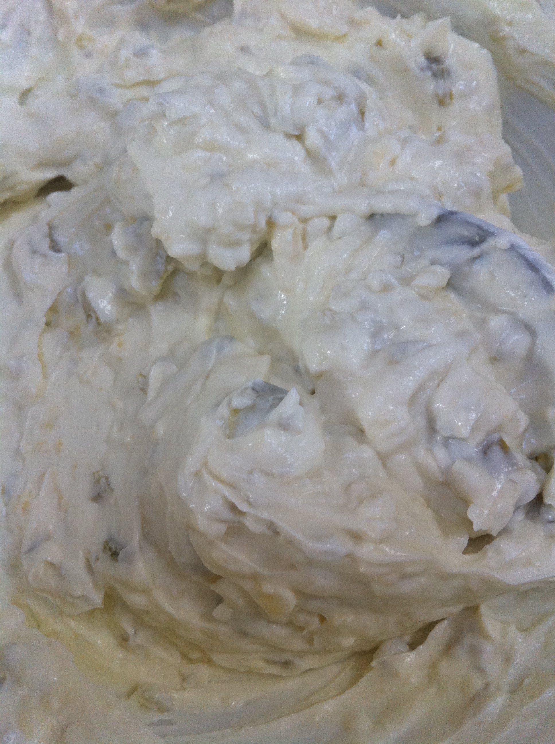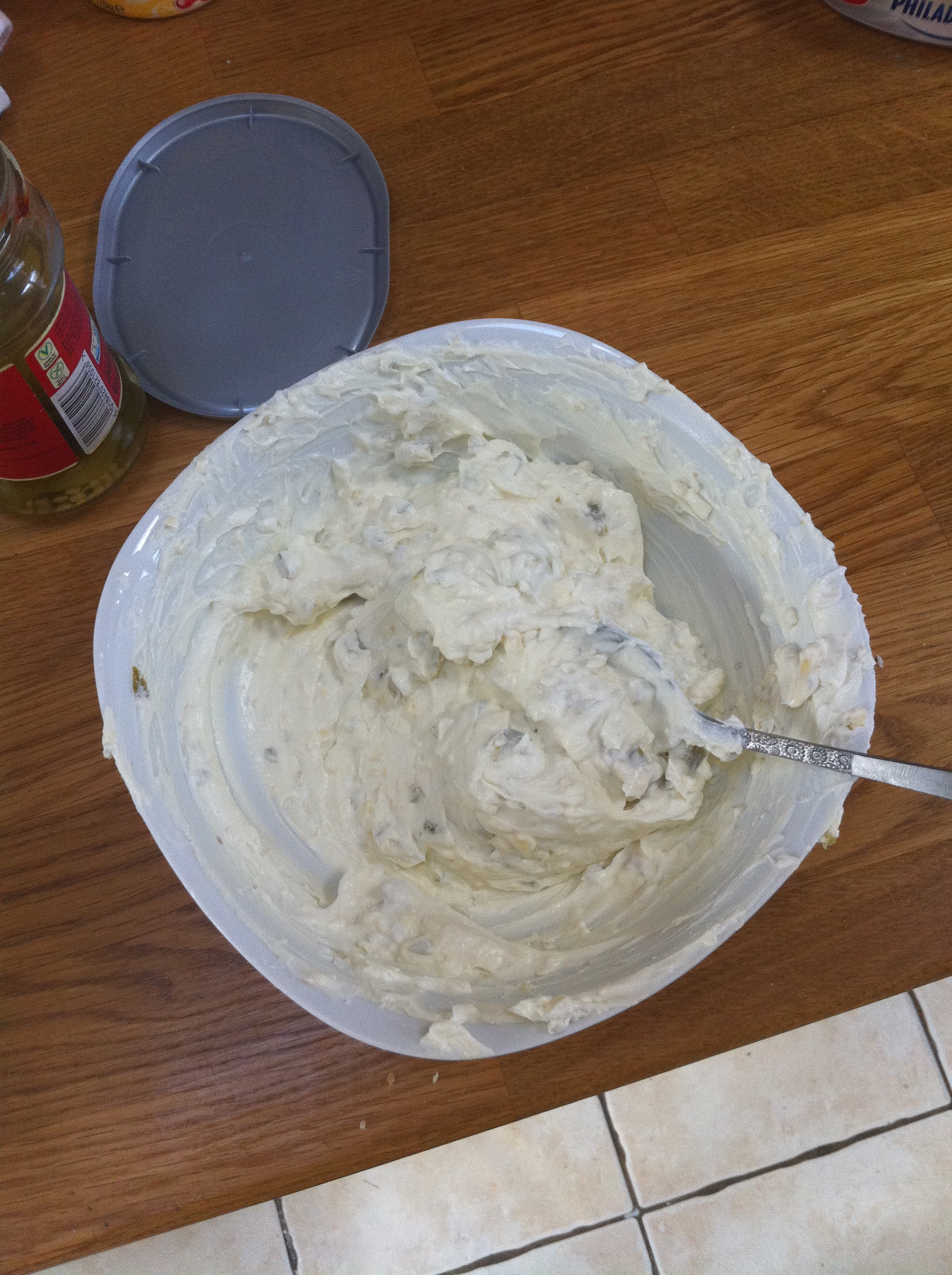 In a bowl, I mixed together a tub of Philadelphia cream cheese and a handful of jarred green jalapeno peppers. I finely chopped the peppers (removed the seeds first! I’m a wuss!) and then chopped them even smaller so that it was nearly a paste. I also added in some of the brine from the jar to moisten the mixture until it was pliable. Finally, I grated some cheddar cheese to really maximise the cheesiness.