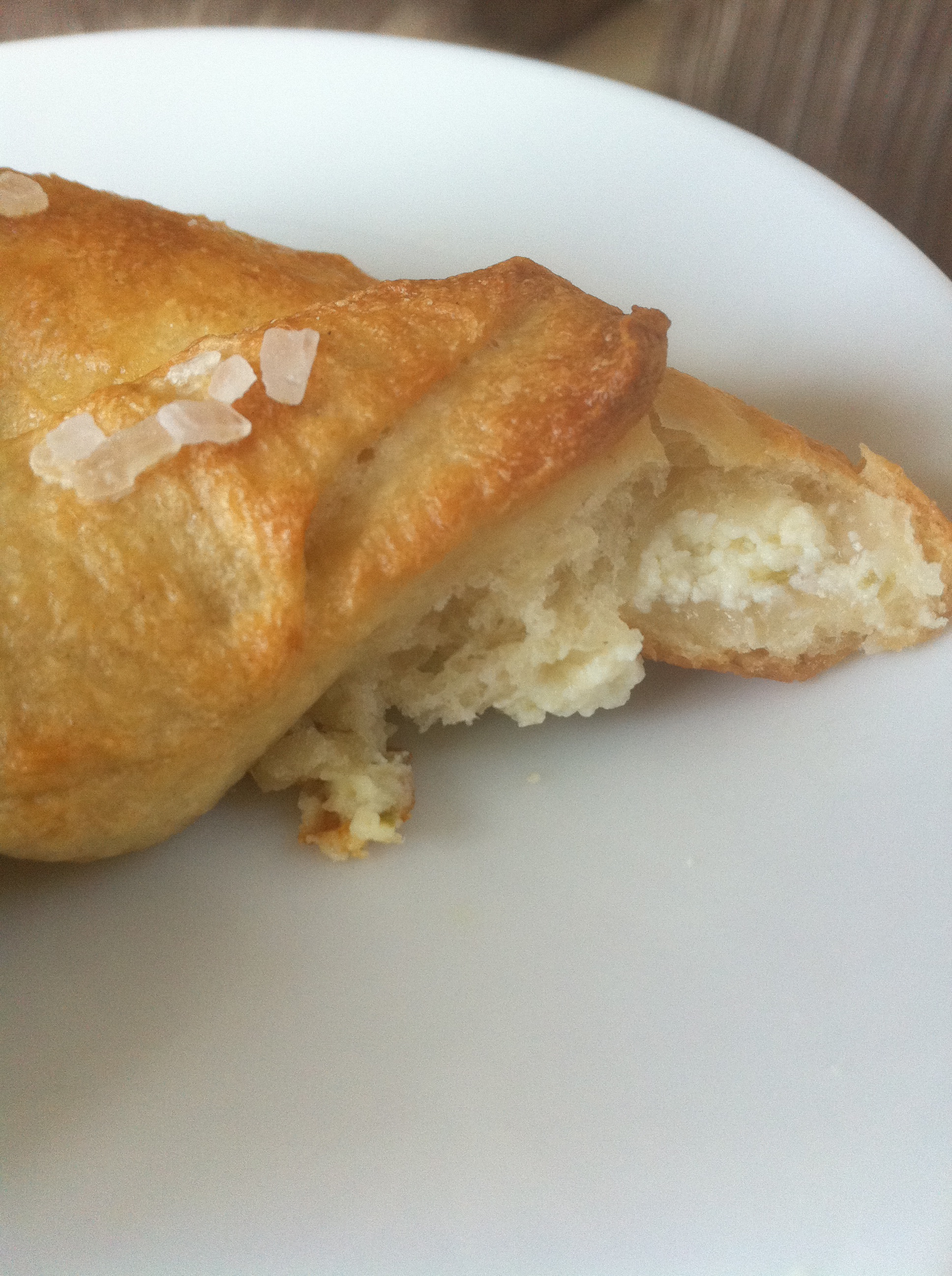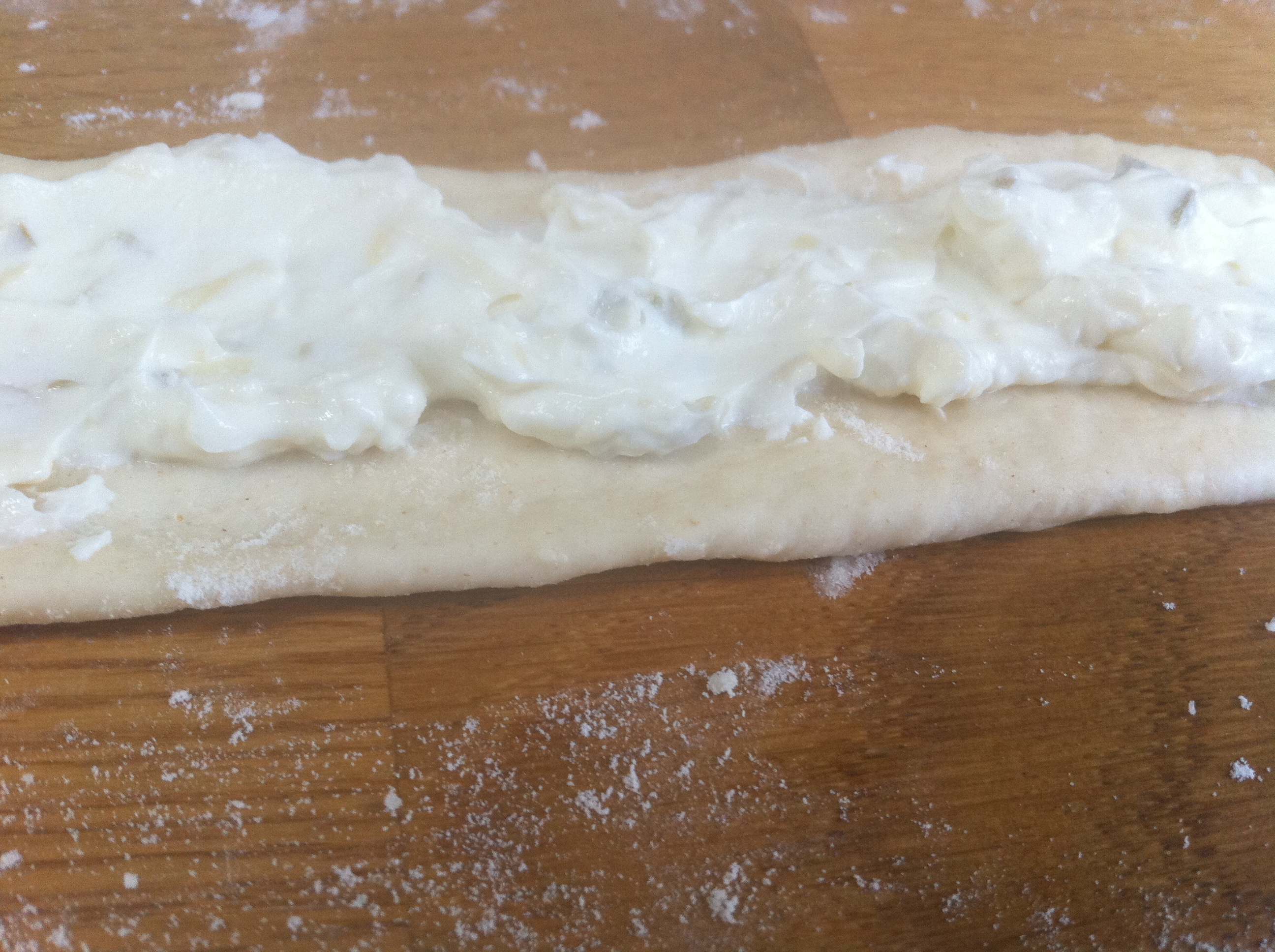 Then it was time to get my roll on. I rolled each ball out into a long strip and then rolled sideways until the dough was wide enough to hold a good portion of the cream cheese filling in the middle.