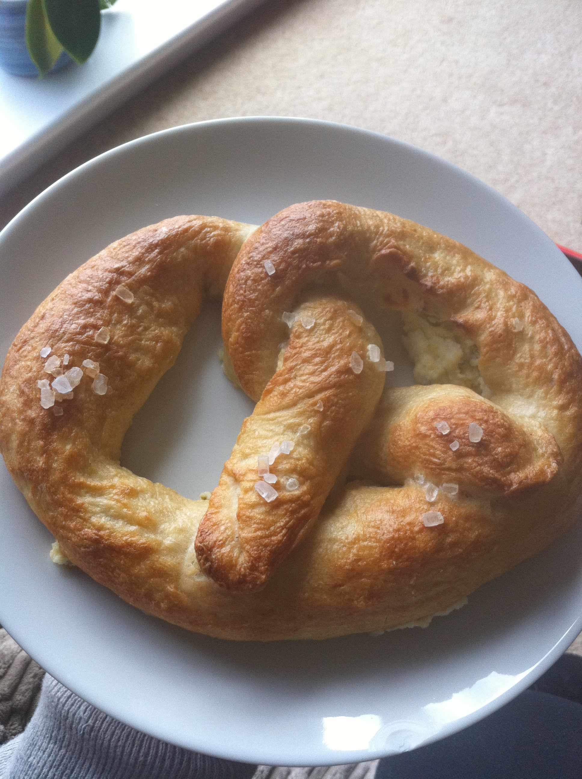 I don’t think I need to tell you that these went down an absolute treat. They were creamy and spicy at the same time with the occasional punch of salt from the rock salt on top. I really recommend getting the rock salt if you can, normal salt isn’t quite the same as you don’t get the texture and crunch. The only thing I would say is I needed to have made sure that the ‘seam’ of the dough wasn’t on the bottom – some of the mixture oozed out during cooking so despite my well oiled tray it stuck, making for a very difficult removal session involving a spatula and quite a lot of swearing. When I made the rest of the batch the next day I made sure to keep the seam on the top which resulted in an intact pretzel with a lovely crispy bottom. Perfect!