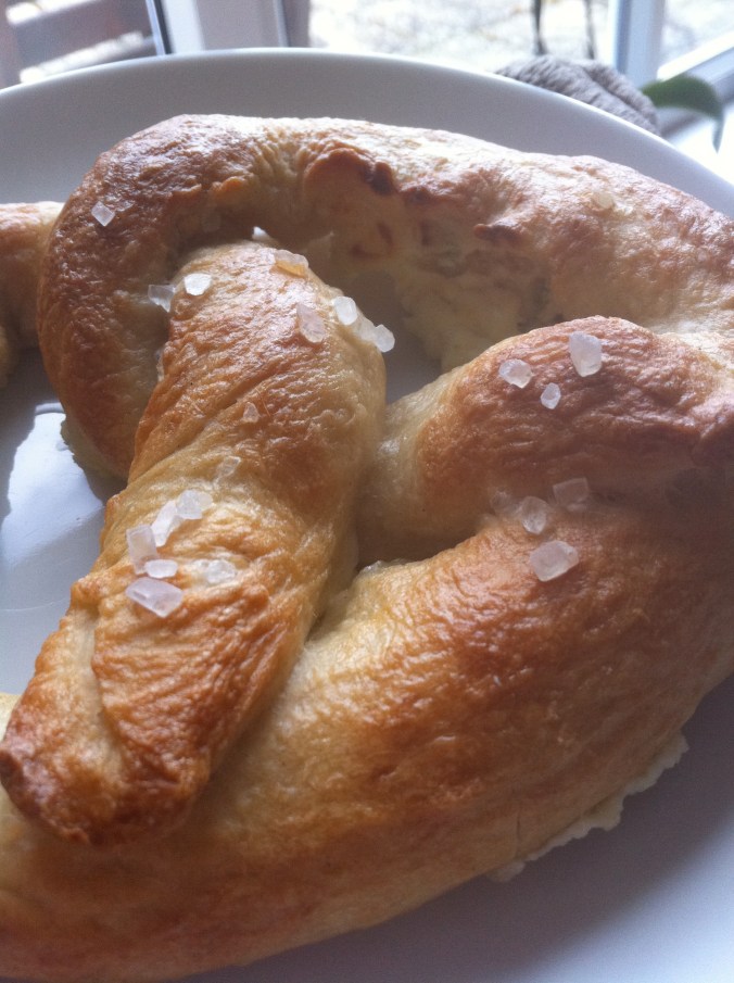 Once the pretzels were laying pretty on the tray I sprinkled them with big chunks of rock salt, placed them in the oven and waited 20 minutes for the darlings to be done.