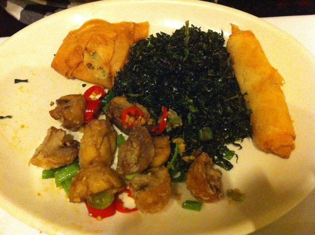 We each ordered 4 starters, specifying that Ben was vegetarian so they wouldn’t come all jumbled up on one platter, chicken splayed on top of tofu and meat juices soaking into seaweed.