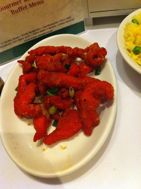 We have been going to this Chinese restaurant for a few years now and have yet to have a bad experience. The food is always hot and tasty, the service is adequate and although I have to drive and can’t have a drink with dinner, the restaurant is not too far away. Every lunchtime and evening (apart from Fridays and Saturdays) the restaurant serves a ‘Grand Buffet’ which is £16.95 per person for dinner and a bit cheaper at lunch. Considering all the food is cooked fresh and brought to your table (none of this getting up out of your seat nonsense!) we believe this is a bargain. In most Chinese restaurants the food has been sat out for an unimaginable amount of time and you have to just grin and bear the luke-warm spring rolls, cold noodles and vomit-inducing film across the top of the sweet and sour sauce. Ergh. At Water Margin, you sit on your bottom for a pleasant couple of hours and people will just bring you food, it’s fantastic. It’s eat as much as you like, but they prefer you to finish all the food you’ve got before you order more, which is fair enough and avoids the ‘eyes bigger than belly’ symptoms I often suffer from when visiting buffets.