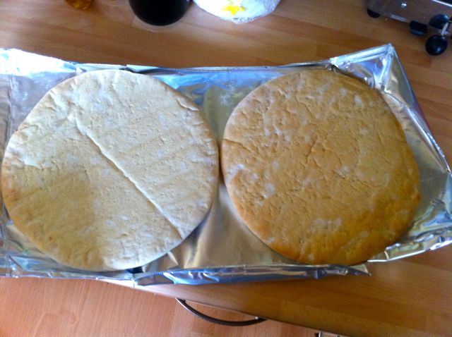Pop your base onto a sheet of greaseproof paper and shape it into a nice circle. Bake it for 10 minutes, flip it over, and bake it on the other side for another 10 minutes. It’ll be quite delicate when you try and flip it so be gentle – let’s not forget it’s essentially egg and cauliflower so not structurally sound!